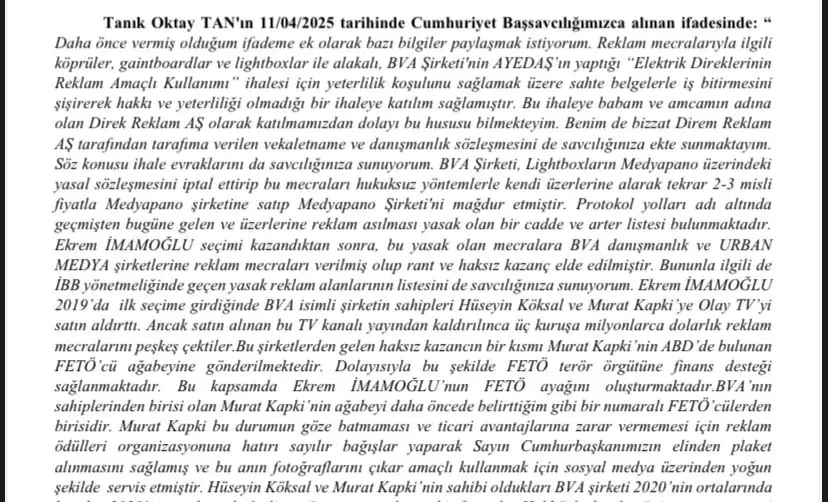 İBB iddianamesinde “tanık” olarak yer alan ve 2018 yılından AKP’den milletvekili adayı olduğu ortaya çıkan Oktay Tan’ın ifadeleri şöyle: